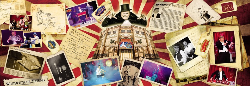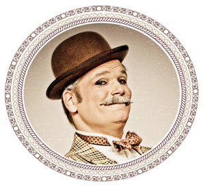 Quand il avait 5 ans, il voulait être magicien ou clown mais ne savait pas quoi choisir…Aujourd’hui, il n’a toujours pas choisi, alors il fait les deux ! C’est en 2000 qu’il créa ce personnage burlesque du magicien de la fin du XIXème siècle qui ne vient pas à bout de ses peines et dont les tours tournent systématiquement à la catastrophe. Tel un bonimenteur, il vous déballe ses tours un à un et vous entraîne dans une parodie de « Grand Maître Es Magie ». Malgrés son application, ou sa mauvaise foi, ses tours de passe-passe sont… ratés ! La superbe allure de l’individu est battue en brèche à tout moment et rapidement il ne maîtrise plus rien ! Les catastrophes s’enchaînent mais rien ne démoralise cet optimiste décalé. Son personnage sympatique lui vaut une adhésion immédiate du public et lui permet de travailler avec autant de facilité au cabaret qu’au cirque. Il fait partie de ces gens qui vont jusqu’au bout de leurs idées. Et des idées, il n’en manque pas. à chaque fois, il se donne les moyens de les réaliser. Un de ces artistes fabricants, aimant le travail bien fait, et qui sont capables de concevoir un numéro de A à Z, jusqu’à en écrire les musiques. C’est pourquoi il ajouta à son répertoire 2 courts numéros musicaux à partir d’instruments de musiques improbables …